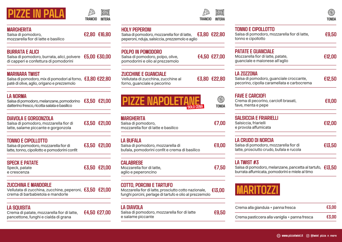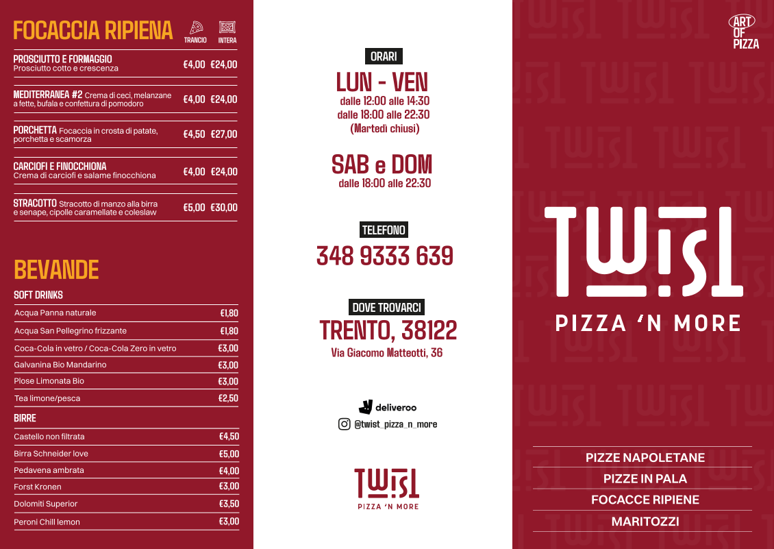 Welcome to Twist Pizza ‘n More, a delightful pizza takeaway nestled at Via Giacomo Matteotti, 36, in Trento, Italy. This culinary gem specializes in authentic Pizza Napoletana, boasting a long-matured dough that's both soft and flavorful. Highlights include the classic Margherita (€7.00) with fresh buffalo mozzarella and basil, and the exquisite La Bufala (€11.00), featuring exquisite mozzarella di bufala and confit cherry tomatoes. Each bite is a testament to the artistry involved in their pizza-making process.